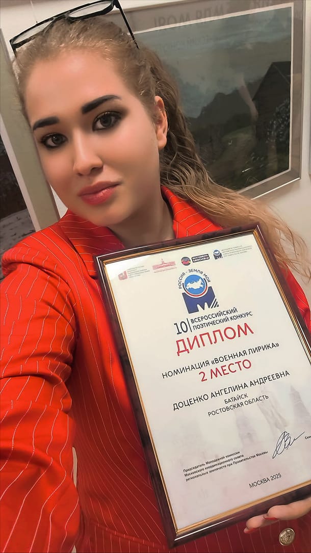 Творчество девушки оценили не только верные поклонники. Совсем недавно Ангелина заняла второе место в номинации «Военная лирика» всероссийского конкурса «Россия – земля моя». Ее работа «Письма в тишину» получила высокую оценку жюри.