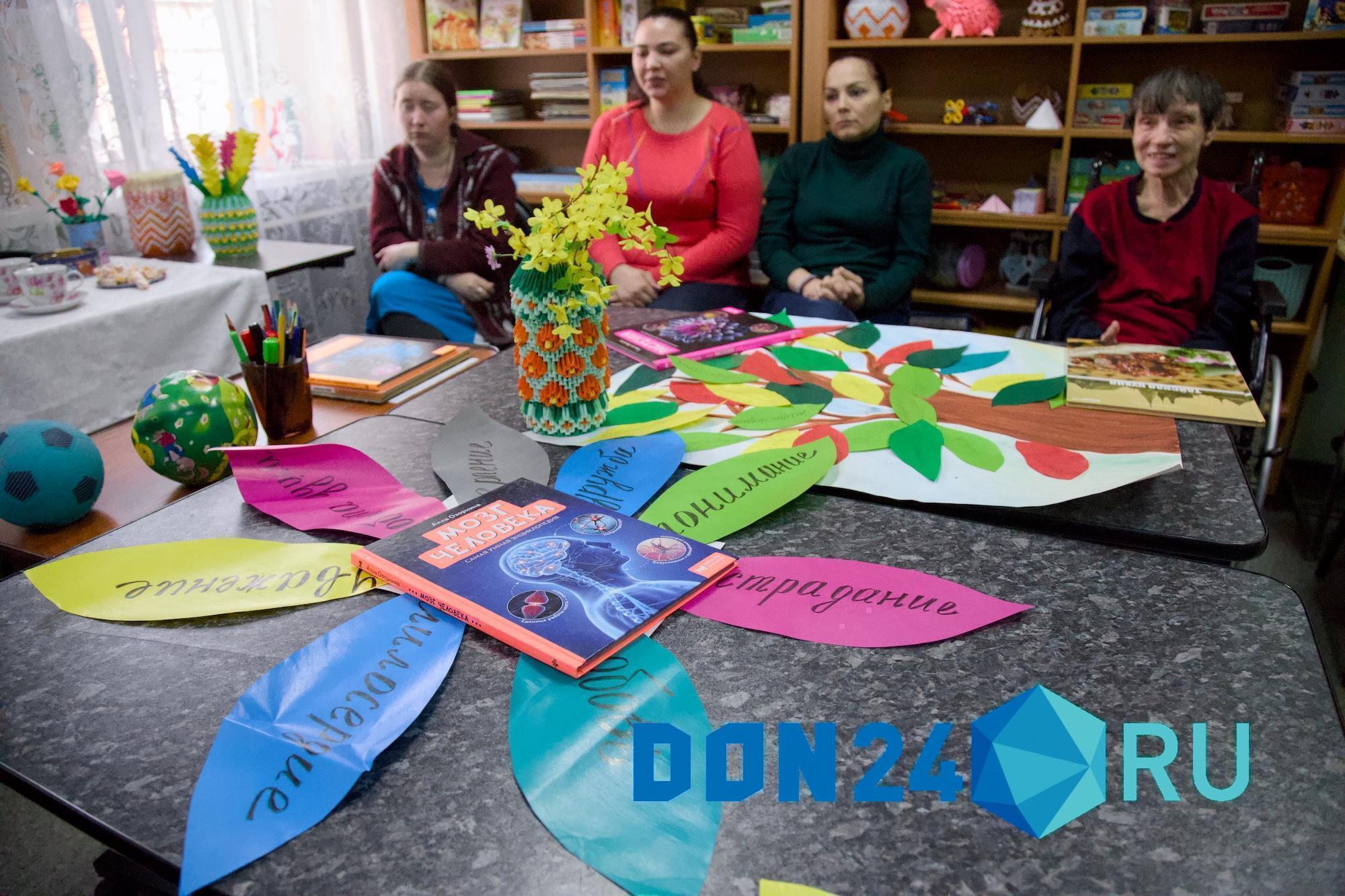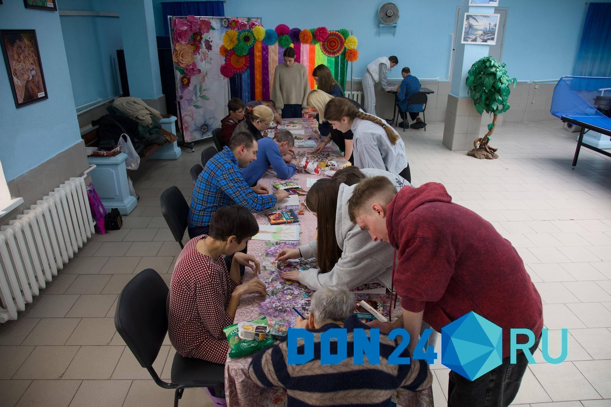 По пятницам в интернат регулярно приходят специалисты «Спиридона». К ним присоединились студенты-волонтеры из Донского государственного технического университета. Пока в зале поют, в соседнем помещении кипит творческая работа: подопечные раскрашивают гипсовые фигурки, лепят из пластилина, собирают мозаику.