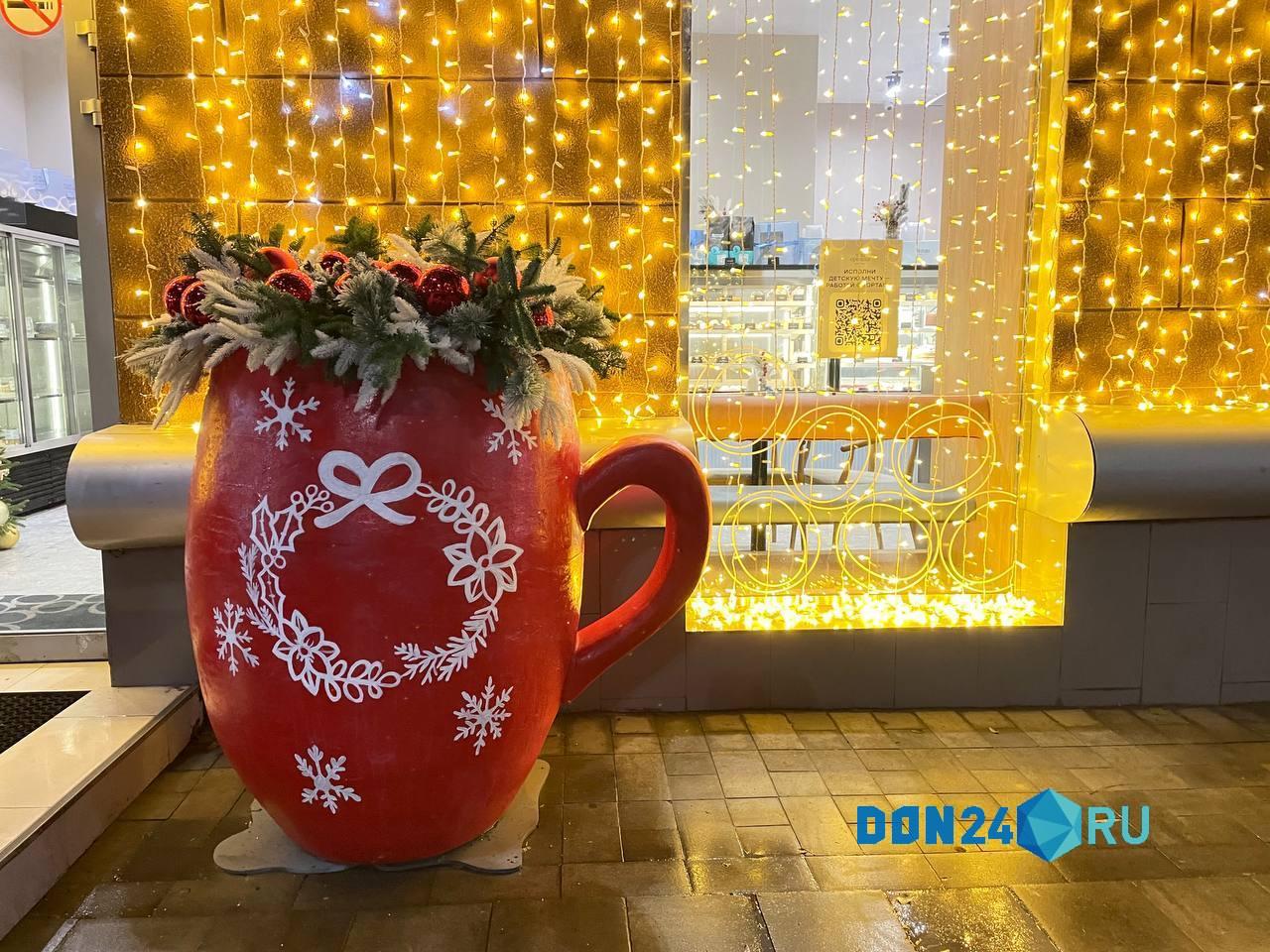 Рядом с кондитерской на Большой Садовой, 105, находится огромная красная кружка с орнаментом и пенкой из елочных веток и игрушек. Самое то для любителей согреться в морозный вечер на прогулке.