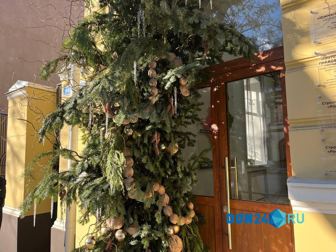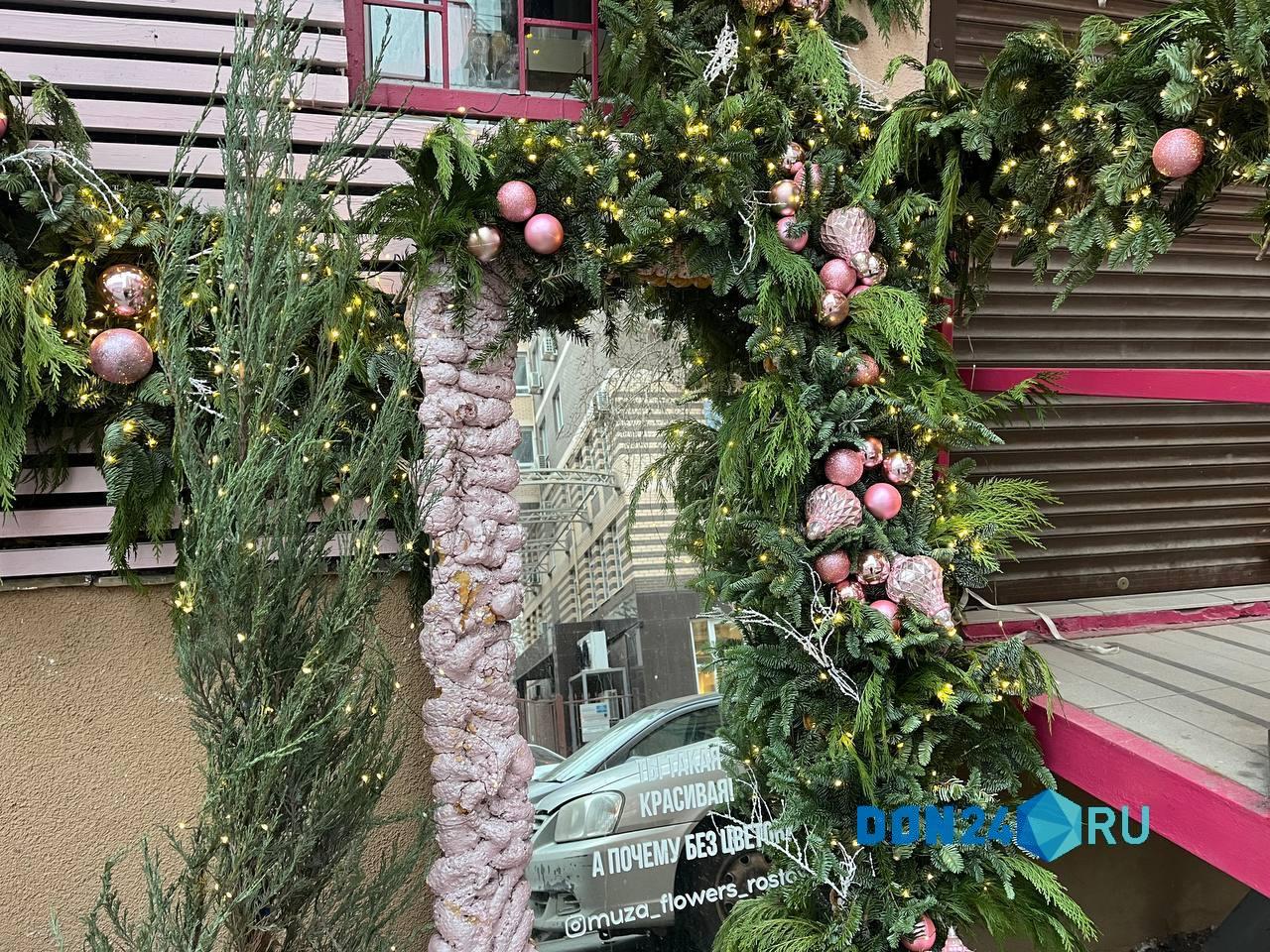 Еще одна атмосферная локация находится на Большой Садовой, 97. Это украшенная входная группа в здание. В инсталляции – еловая арка с сосульками, блестящими шарами и шишками. Особенно выигрышно она смотрится, когда из-за туч выглядывает солнце.