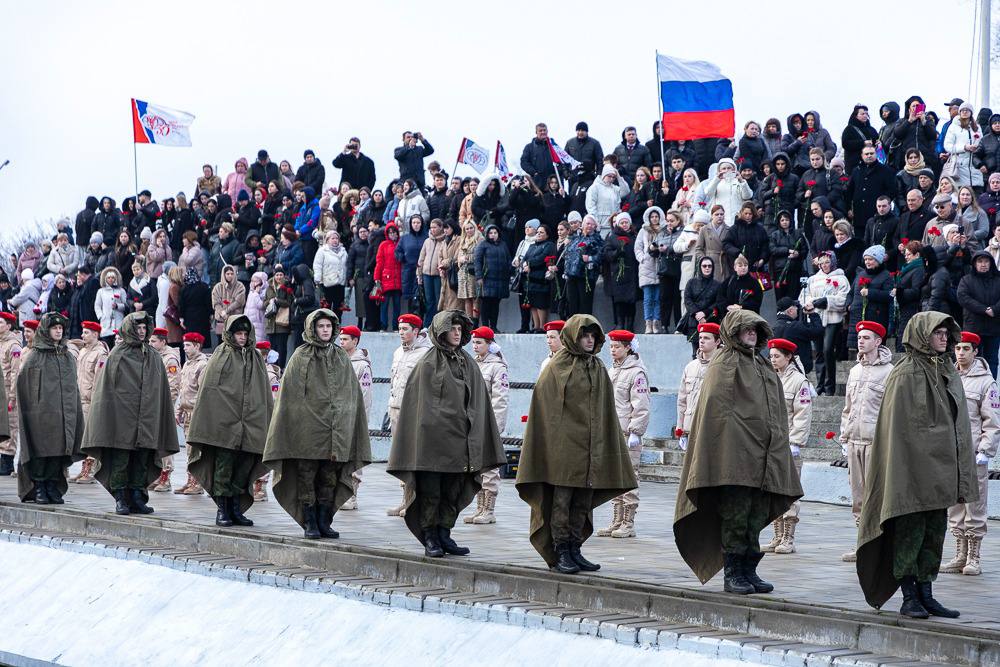 Ростовская область, 14 февраля 2024. DON24.RU. В Ростове-на-Дону жители и гости города несут цветы к мемориалу «Воинам-освободителям города от немецко-фашистских захватчиков». Тожественная церемония на Театральной площади дала старт памятным акциям в честь 81-й годовщины освобождения донской столицы.