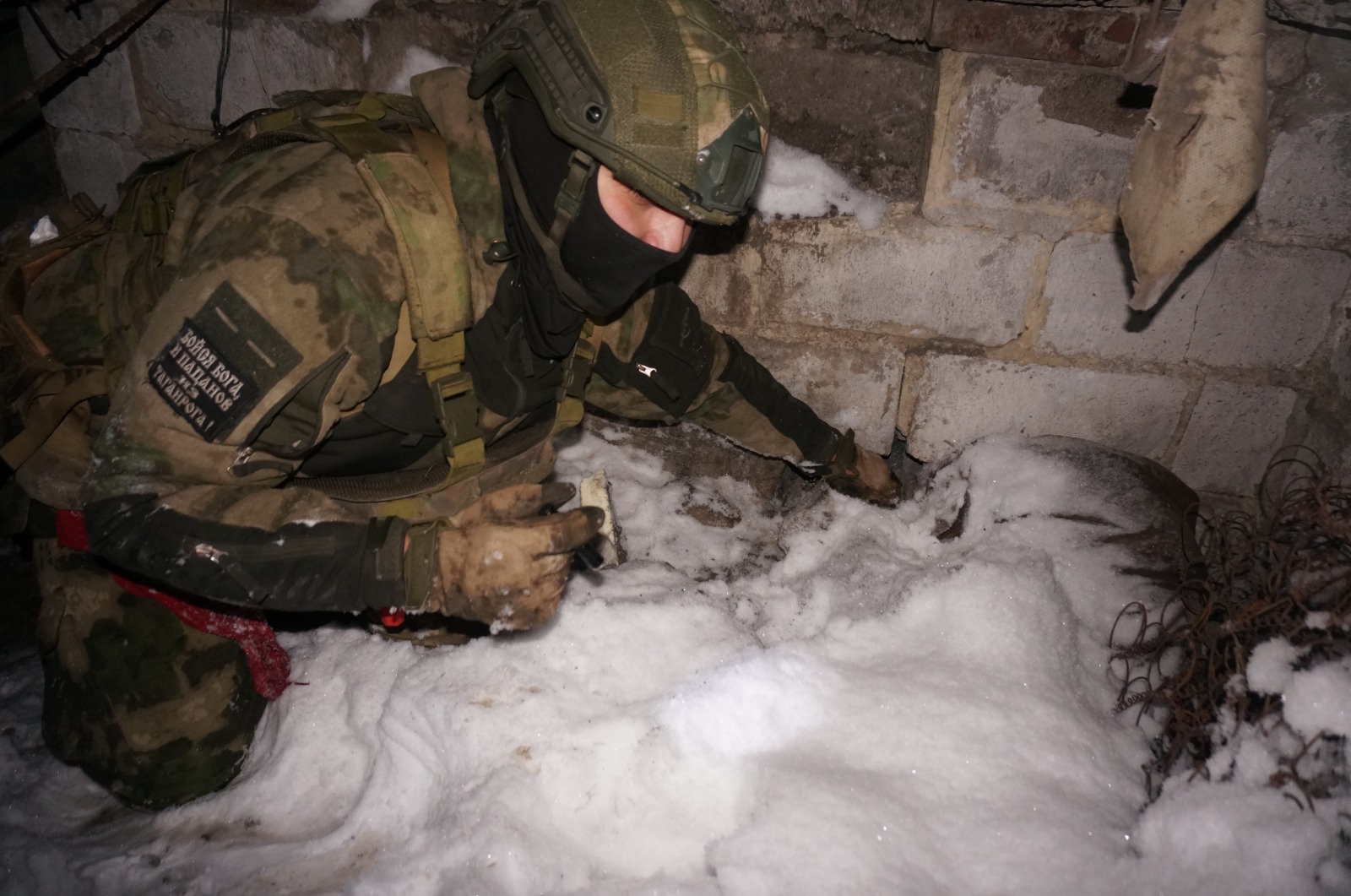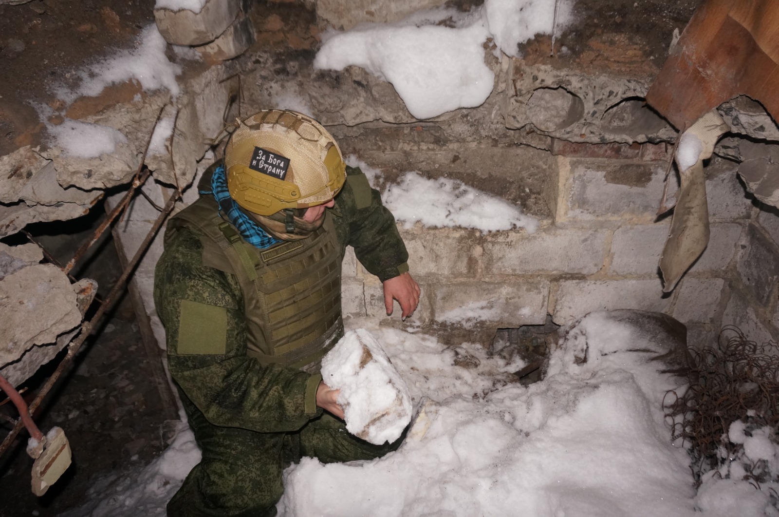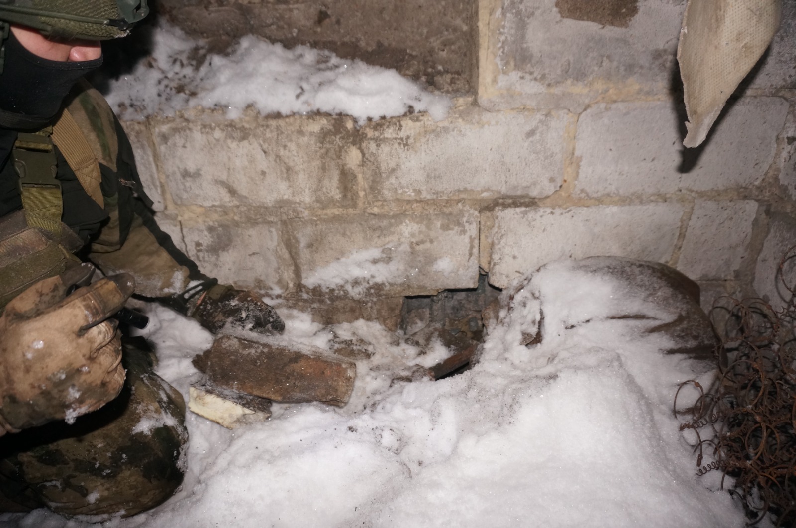 Поблагодарив бойцов за горячий чай и душевное общение, мы продолжили путь. Ныряем в один подвал, переходим в другой. Эфиоп идет через глубокий снег к разрушенному дому. Какое-то время разведчики исследуют снежный покров, но не находят подвала. Круг поиска расширен. Наконец сигнал фонариком извещает: точка найдена.