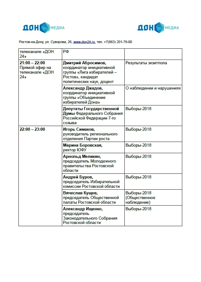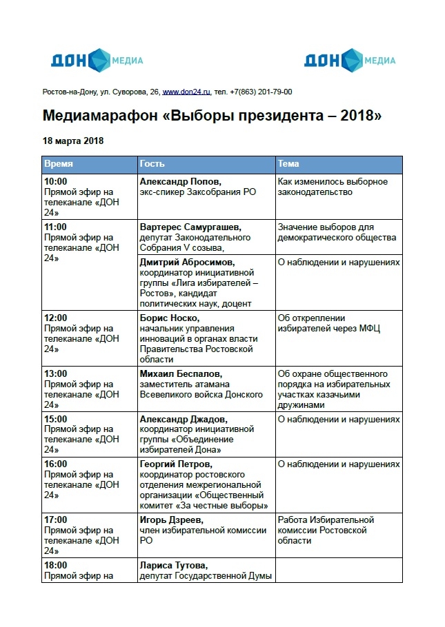 Политики, правозащитники и общественные деятели региона посетят пресс-центр «Дон-медиа», где обсудят актуальные для дня выборов темы: выборное законодательство, нарушения на избирательных участках, практика открепления избирателей, работа Избиркома и многое другое. Среди спикеров будут присутствовать: депутат Заксобрания V созыва Вартерес Самургашев, депутат Государственной Думы Лариса Тутова, ректор Южного федерального университета Марина Боровская, член избирательной комиссии Ростовской области Игорь Дзреев и многие другие. Их визиты в «Дон-медиа» будут выходить в прямой эфир на телеканале «ДОН 24». Всего ожидаются визиты, по меньшей мере, пятнадцати спикеров.